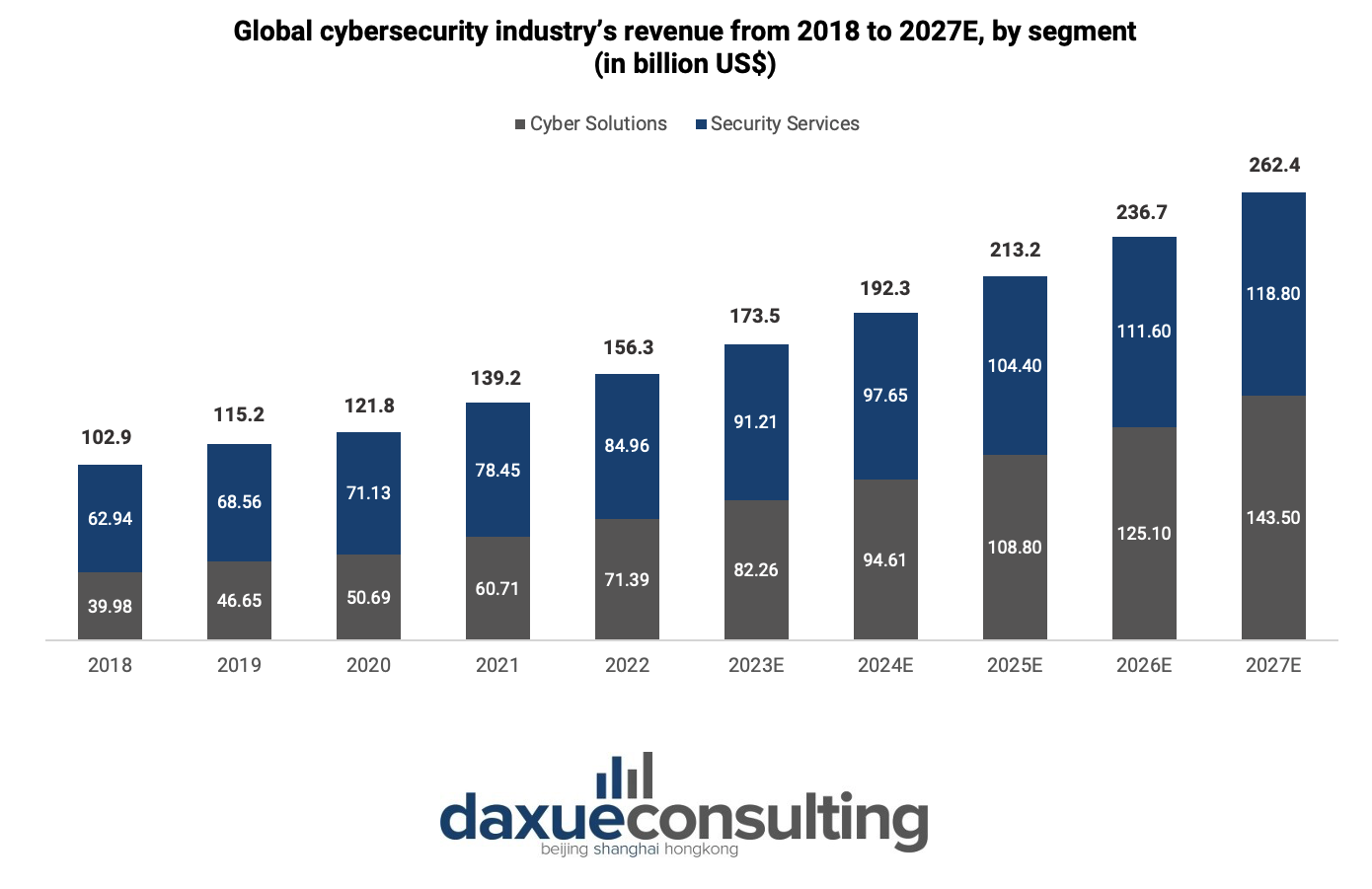 Fig.1 Graph source: Statista, designed by Daxue Consulting, China’s cybersecurity industry’s revenue from 2018 to 2027E, by segment [4]